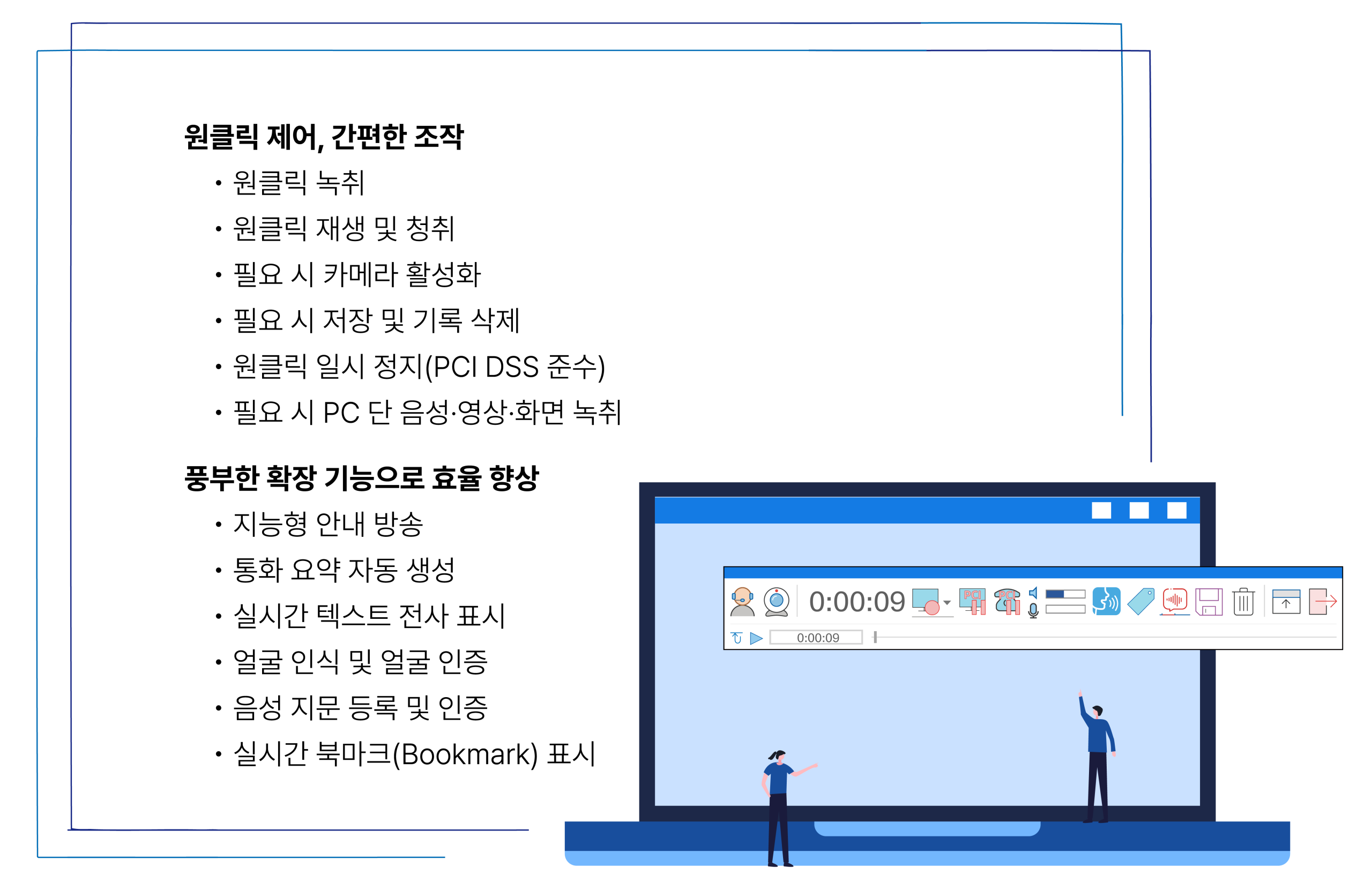 화면 워터마크 기능 지원으로 정보 유출 방지 클라이언트 화면 녹화 데이터 자동 무결성 검증 및 업로드 지원 클라이언트 단 상담원 얼굴 인증 지원으로 데이터 보안 강화 클라이언트 녹화 서비스 및 프로세스 보호(가디언) 기능 제공으로 오작동에 의한 서비스 중단 또는 프로세스 종료 방지 |
