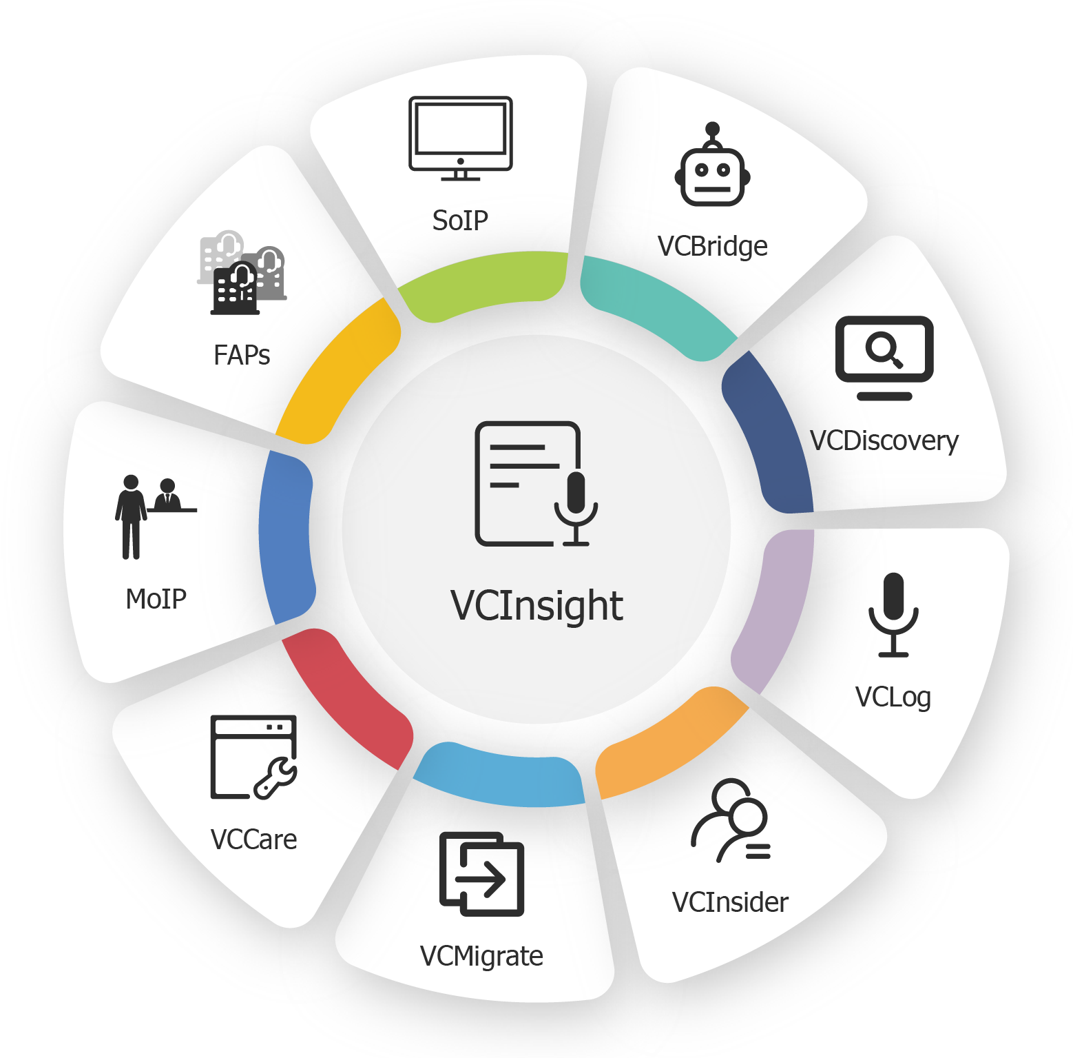 VCInsight는 고객 경험 지능형 관리 제품군의 핵심 구성원입니다. VCLog, SoIP, MoIP, FAPs, VCBridge, VCDiscovery, VCBot, VCInsider 등과 유기적으로 결합하여 완전하면서도 유연한 고객 경험 지능형 관리 통합 솔루션을 구축할 수 있습니다.